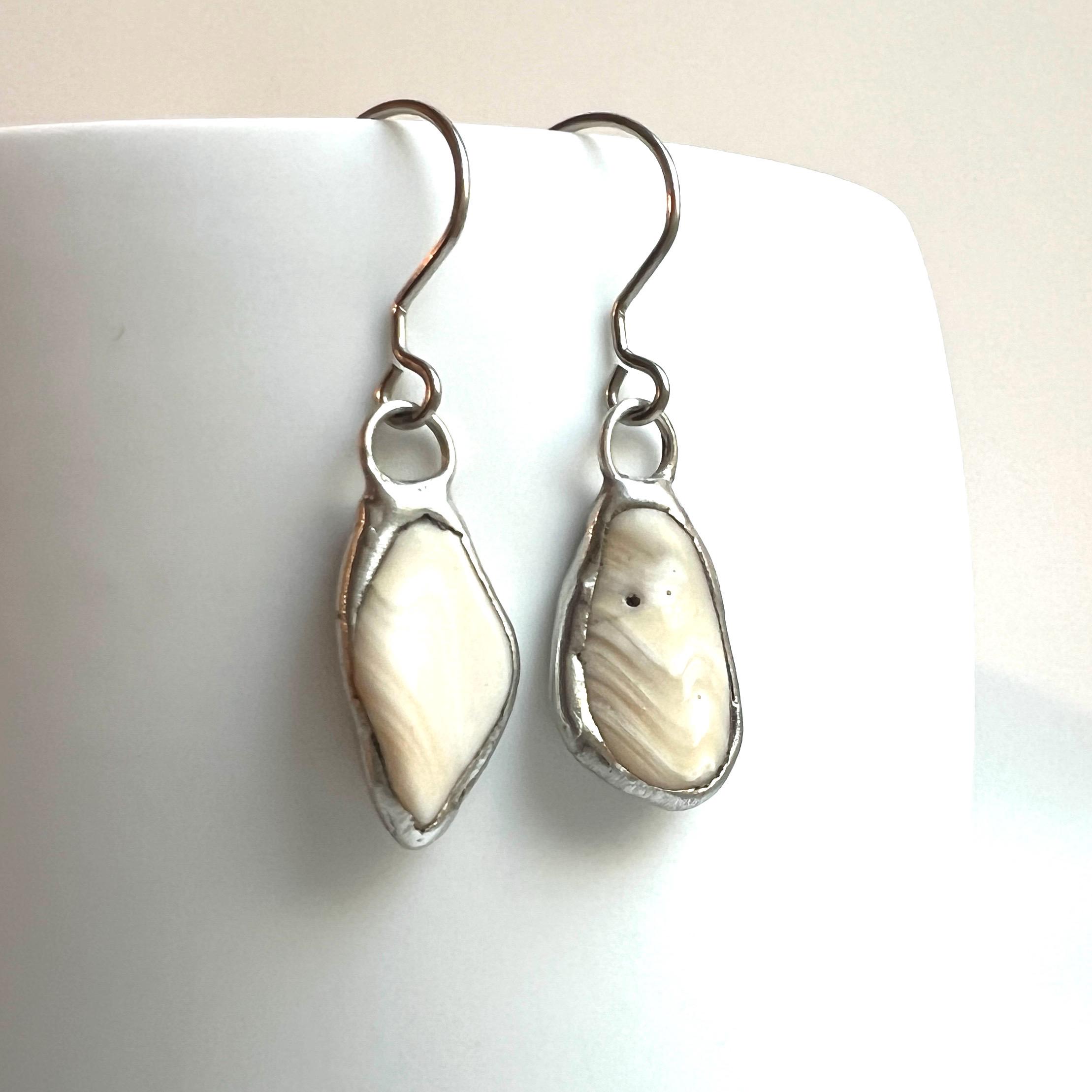 Handcrafted, one-of-a-kind, Tiffany Soldered Oregon Coast Shell Earrings. The pair have sterling jump rings & hypoallergenic stainless steel ear wires.